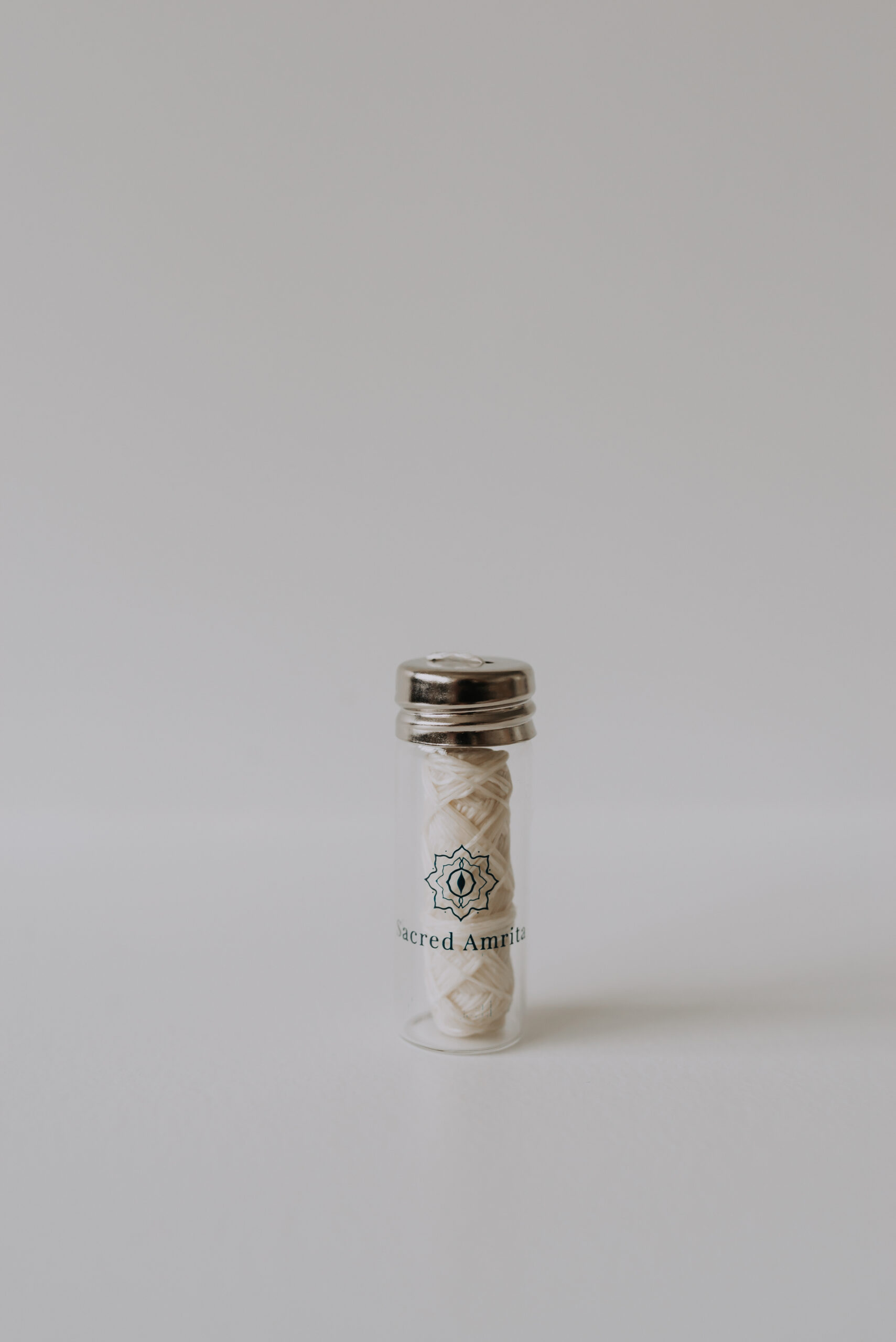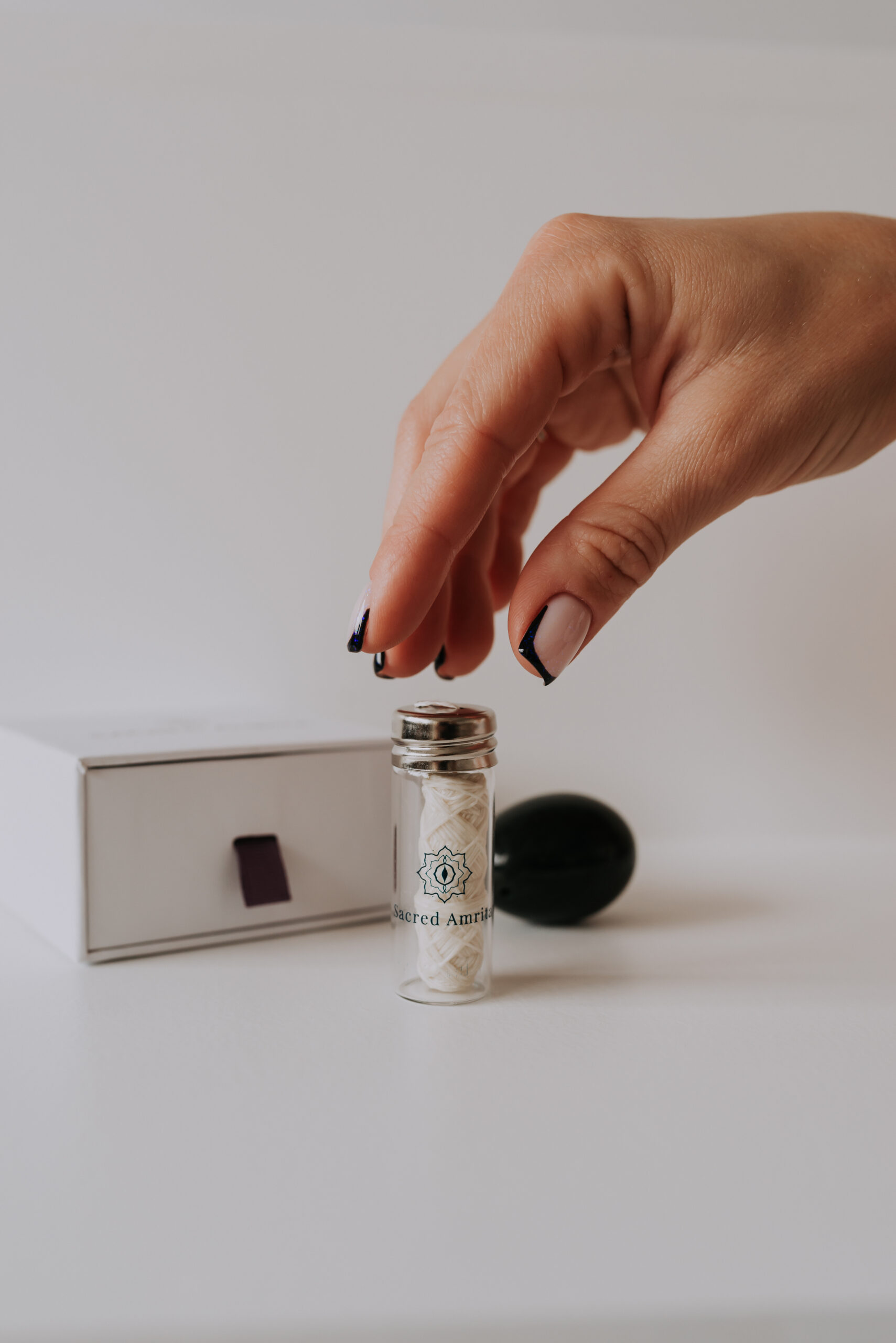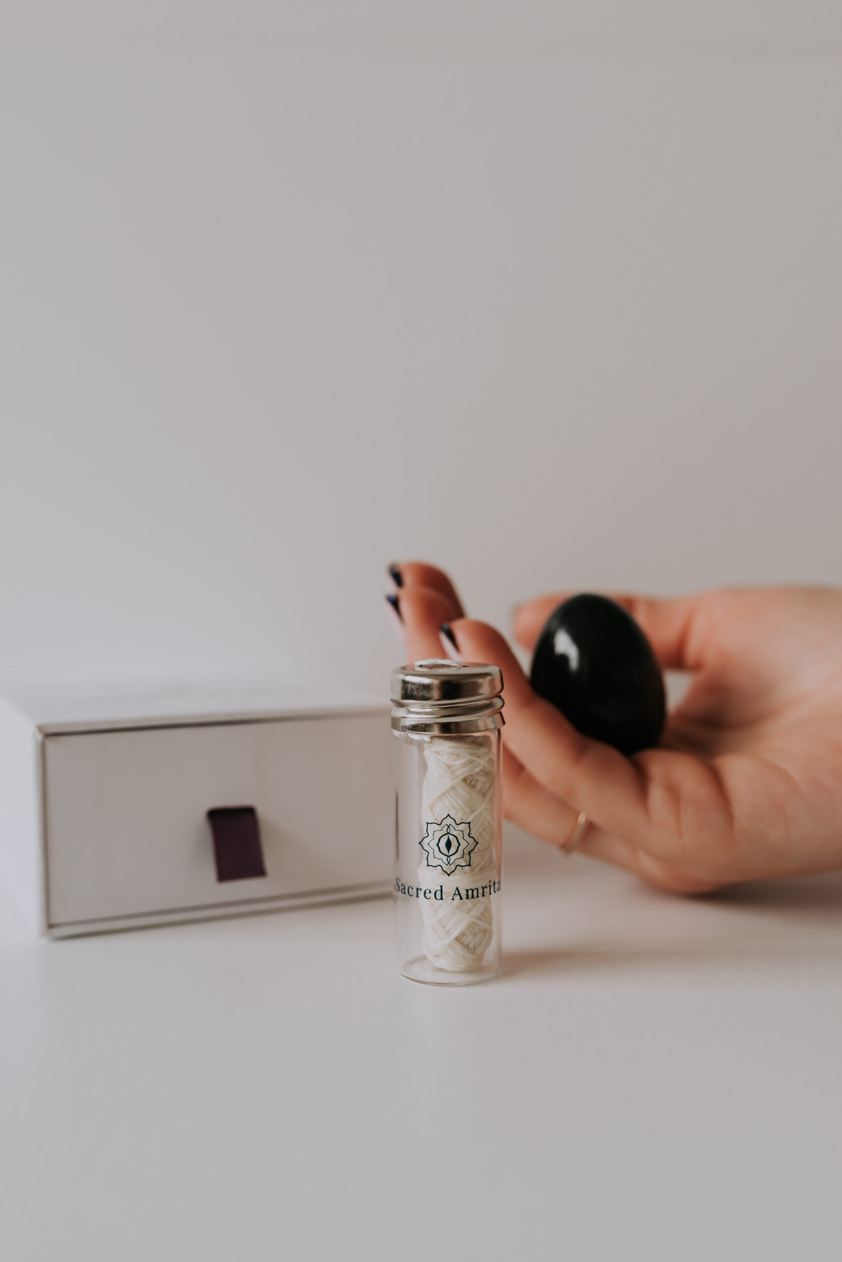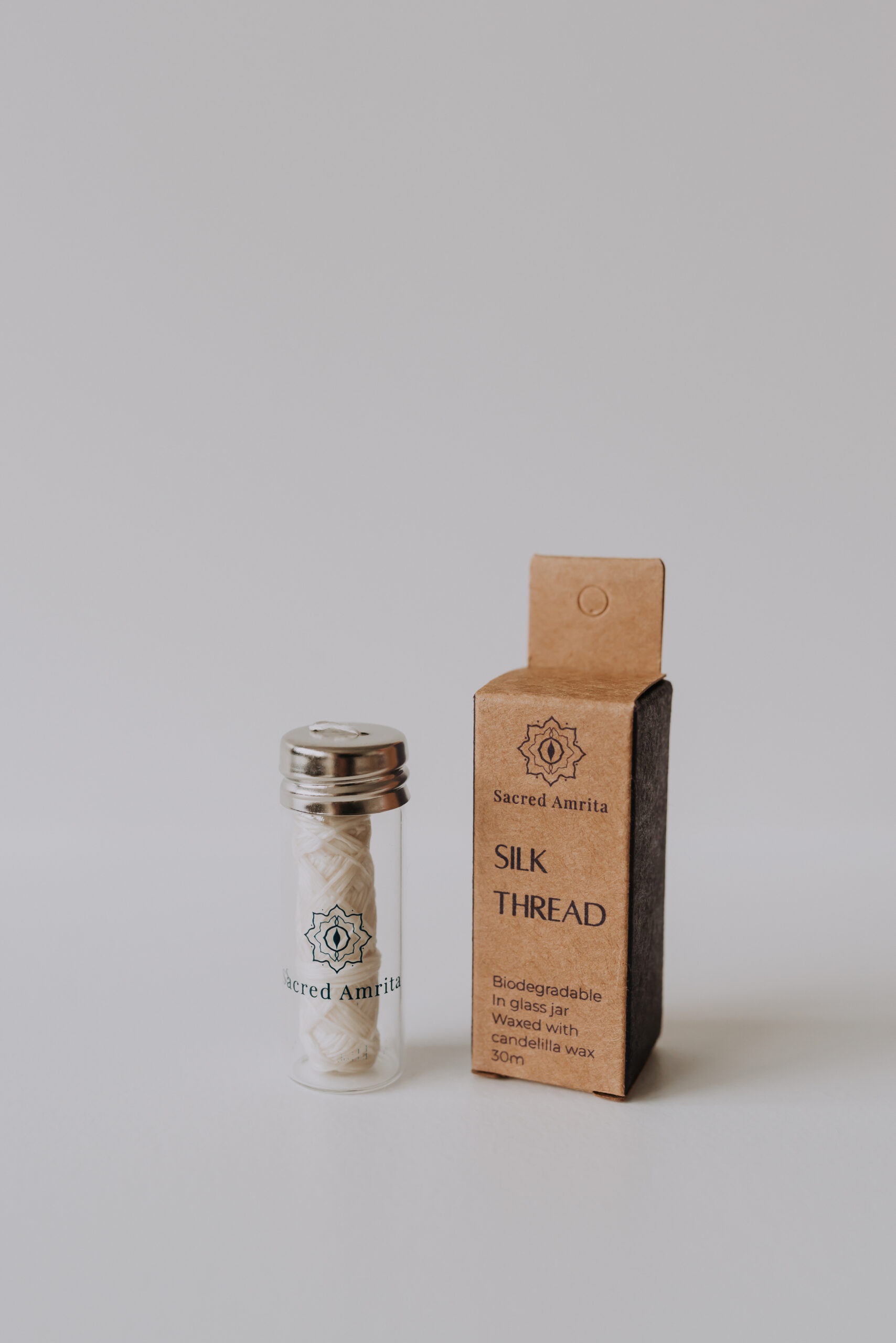 For yoni egg practices, it is advisable to use a silk thread that can be threaded through the hole of the yoni egg and used during exercises. Silk is a compostable and environmentally friendly substitute for conventional dental floss. The thread is packaged in a glass container with a small opening at the top, allowing you to pull out and cut the thread as needed. For more information on how to use the thread, watch the video guide here and read the instructions here. In addition to using the thread for yoni egg practices, it can also be used as dental floss.